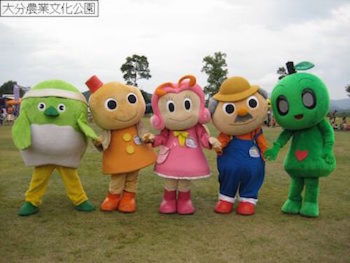大分農業文化公園のマスコットキャラクター「はなちゃん」「おじちゃん」「いもっちゃま」。